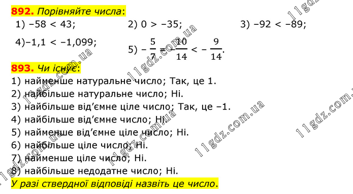 892. Порівняйте числа: 1) –58 < 43; 2) 0 > –35; 3) –92 < –89; 4)–1,1 < –1,099; 5) – 5/7 = –10/14 < – 9/14. 893. Чи існує: 1) найменше натуральне число; Так, це 1. 2) найбільше натуральне число; Ні. 3) найбільше від’ємне ціле число; Так, це –1. 4) найбільше від’ємне число; Ні. 5) найменше від’ємне ціле число; Ні. 6) найбільше ціле число; Ні. 7) найменше ціле число; Ні. 8) найбільше недодатне число; Ні. У разі ствердної відповіді назвіть це число.