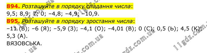 894. Розташуйте в порядку спадання числа: 9,5; 8,9; 7; 0; –4,8; –4,9; –10,9. 895. Розташуйте в порядку зростання числа: –11 (В); –6 (Я); –5,9 (З); –4,1 (О); –4,01 (В); 0 (С); 0,5 (Ь); 4,5 (К); 5,3 (А). ВЯЗОВСЬКА.