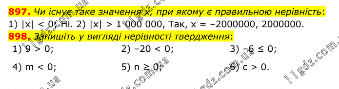 897. Чи існує таке значення х, при якому є правильною нерівність: 1) |x| < 0; Ні. 2) |x| > 1 000 000, Так, х = –2000000, 2000000. 898. Запишіть у вигляді нерівності твердження: 1) 9 > 0; 2) –20 < 0; 3) –6 ≤ 0; 4) m < 0; 5) n ≥ 0; 6) c > 0.