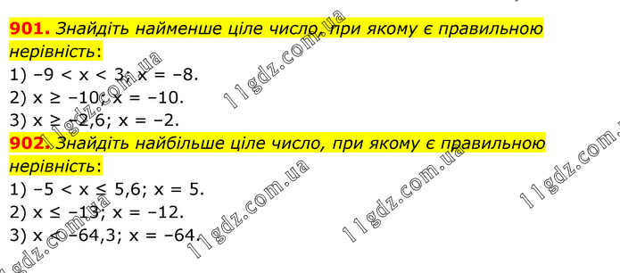 901. Знайдіть найменше ціле число, при якому є правильною нерівність: 1) –9 < х < 3; х = –8. 2) х ≥ –10; х = –10. 3) х ≥ –2,6; х = –2. 902. Знайдіть найбільше ціле число, при якому є правильною нерівність: 1) –5 < х ≤ 5,6; х = 5. 2) х ≤ –13; х = –12. 3) х < –64,3; х = –64.