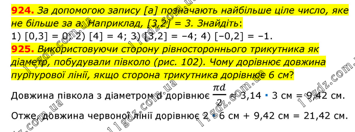 924. За допомогою запису [а] позначають найбільше ціле число, яке не більше за а. Наприклад, [3,2] = 3. Знайдіть: 1) [0,3] = 0; 2) [4] = 4; 3) [3,2] = –4; 4) [–0,2] = –1. 925. Використовуючи сторону рівностороннього трикутника як діаметр, побудували півколо (рис. 102). Чому дорівнює довжина пурпурової лінії, якщо сторона трикутника дорівнює 6 см? Довжина півкола з діаметром d дорівнює πd/2 ≈ 3,14 ∙ 3 см = 9,42 см. Отже, довжина червоної лінії дорівнює 2 ∙ 6 см + 9,42 см = 21,42 см.