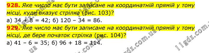 928. Яке число має бути записане на координатній прямій у тому місці, куди вказує стрілка (рис. 103)? а) 34 + 8 = 42; б) 120 – 34 = 86. 929. Яке число має бути записане на координатній прямій у тому місці, де бере початок стрілка (рис. 104)? а) 41 – 6 = 35; б) 96 + 18 = 114.