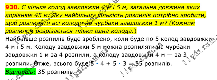 Є кілька колод завдовжки 4 м і 5 м, загальна довжина яких дорівнює 45 м. Яку найбільшу кількість розпилів потрібно зробити, щоб розпиляти всі колоди на чурбаки завдовжки 1 м? (Кожним розпилом розрізається тільки одна колода.) Найбільше розпилів буде зроблено, коли буде по 5 колод завдовжки 4 м і 5 м. Колоду завдовжки 5 м можна розпиляти на чурбаки завдовжки 1 м за 4 розпили, а колоду завдовжки 4 м — за 3 розпили. Отже, всього буде 5 ∙ 4 + 5 ∙ 3 = 35 розпилів. Відповідь: 35 розпилів.