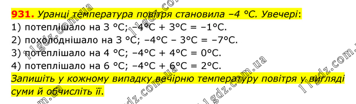 931. Уранці температура повітря становила –4 °С. Увечері: 1) потеплішало на З °С; –4°С + З°С = –1°С. 2) похолоднішало на З °С; –4°С – 3°С = –7°С. 3) потеплішало на 4 °C; –4°С + 4°С = 0°С. 4) потеплішало на 6 °С; –4°С + 6°С = 2°С. Запишіть у кожному випадку вечірню температуру повітря у вигляді суми й обчисліть її.