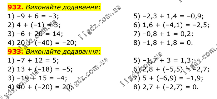 932. Виконайте додавання: 1) –9 + 6 = –3; 2) 4 + (–1) = 3; 3) –6 + 20 = 14; 4) 20 + (–40) = –20; 5) –2,3 + 1,4 = –0,9; 6) 1,6 + (–4,1) = –2,5; 7) –0,8 + 1 = 0,2; 8) –1,8 + 1,8 = 0. 933. Виконайте додавання: 1) –7 + 12 = 5; 2) 13 + (–18) = –5; 3) –19 + 15 = –4; 4) 40 + (–20) = 20; 5) –1,7 + 3 = 1,3; 6) 2,8 + (–5,5) = –2,7; 7) 5 + (–6,9) = –1,9; 8) 2,7 + (–2,7) = 0.
