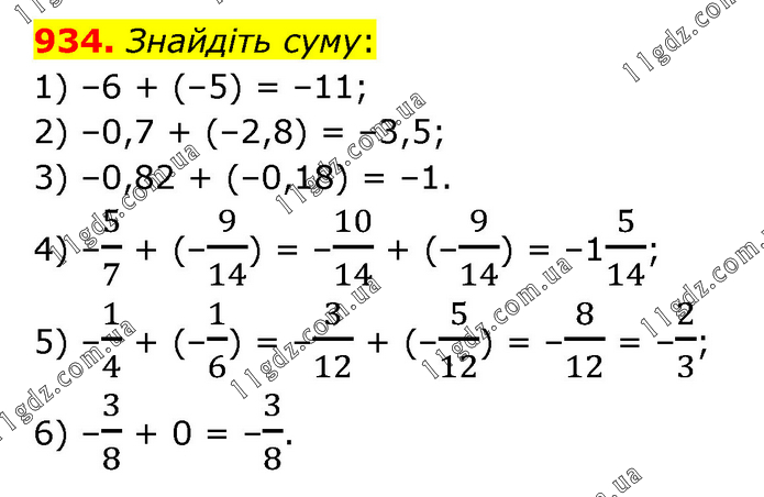 Знайдіть суму: 1) –6 + (–5) = –11; 2) –0,7 + (–2,8) = –3,5; 3) –0,82 + (–0,18) = –1. 4) –5/7 + (–9/14) = –10/14 + (–9/14) = –15/14; 5) –1/4 + (–1/6) = –3/12 + (–5/12) = –8/12 = –2/3; 6) –3/8 + 0 = –3/8.