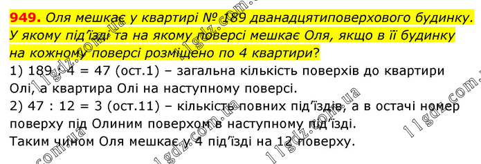 Оля мешкає у квартирі № 189 дванадцятиповерхового будинку. У якому під’їзді та на якому поверсі мешкає Оля, якщо в її будинку на кожному поверсі розміщено по 4 квартири? 1) 189 : 4 = 47 (ост.1) – загальна кількість поверхів до квартири Олі, а квартира Олі на наступному поверсі. 2) 47 : 12 = 3 (ост.11) – кількість повних під’їздів, а в остачі номер поверху під Олиним поверхом в наступному під’їзді. Таким чином Оля мешкає у 4 під’їзді на 12 поверху.