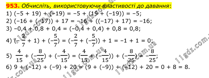 Обчисліть, використовуючи властивості до давання: 1) (–5 + 19) + (–19) = –5 + (19 + (–19)) = –5; 2) (–16 + (–17)) + 17 = –16 + ((–17) + 17) = –16; 3) –0,4 + 0,8 + 0,4 = (–0,4 + 0,4) + 0,8 = 0,8; 4) (– 2/7 + 1) + (–5/7) = (–2/7 + (–5/7)) + 1 = –1 + 1 = 0; 5) 4/15 + (–8/25) + (–4/15) = (4/15 + (–4/15)) + (–8/25) = –8/25; 6) 9 + (–12) + (–9) + 20 = (9 + (–9)) + (–12) + 20 = 0 + 8 = 8.