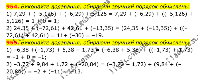 954. Виконайте додавання, обираючи зручний порядок обчислень: 1) 7,29 + (–5,126) + (–6,29) + 5,126 = 7,29 + (–6,29) + ((–5,126) + 5,126) = 1 + 0 = 1; 2) 24,35 + (–72,61) + 42,61 + (–13,35) = (24,35 + (–13,35)) + ((–72,61) + 42,61) = 11+ (–30) = –19. 955. Виконайте додавання, обираючи зручний порядок обчислень: 1) –6,38 +(–1,73) + 5,38 + 1,73 = (–6,38 + 5,38) + ((–1,73) + 1,73) = –1 + 0 = –1; 2) –3,72 + 9,84 + 1,72 + (–20,84) = (–3,72 + 1,72) + (9,84 + (–20,84)) = –2 + (–11) = –13.