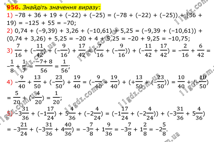 Знайдіть значення виразу: 1) –78 + 36 + 19 + (–22) + (–25) = (–78 + (–22) + (–25)) + (36 + 19) = –125 + 55 = –70; 2) 0,74 + (–9,39) + 3,26 + (–10,61) + 5,25 = (–9,39 + (–10,61)) + (0,74 + 3,26) + 5,25 = –20 + 4 + 5,25 = –20 + 9,25 = –10,75; 3) 7/16 + (–11/42) + (–9/16) + 17/42 = (7/16 + (–9/16)) + (–11/42 + 17/42) = –2/16 + 6/42 = –1/8 + 1/7 = (-7+ 8)/56 = 1/56; 4) –9/40 + 13/50 + (–23/50) + 19/40 = (–9/40 + 19/40) + (+13/50 + (–23/50)) = 10/40 + (–10/50) = 5/20 + (–4/20) = 1/20; 5) –331/36 + (–117/24) + 54/36 + (–24/24) = (–117/24 + (–24/24)) + (–331/36 + 54/36) = –321/24 + (–331/36 + 440/36) = –37/8 + 19/36 = –37/8 + 12/8 = –25/8.