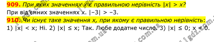 909. При яких значеннях х є правильною нерівність |x| > x? При від’ємних значеннях х. |–3| > –3. 910. Чи існує таке значення х, при якому є правильною нерівність: 1) |х| < х; Ні. 2) |x| ≤ x; Так. Любе додатне число. 3) |x| ≤ 0; х = 0.