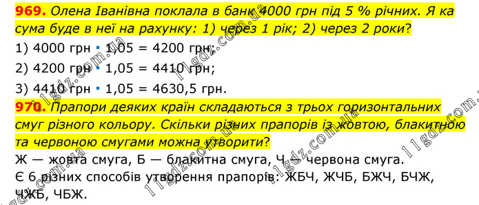 969. Олена Іванівна поклала в банк 4000 грн під 5 % річних. Я ка сума буде в неї на рахунку: 1) через 1 рік; 2) через 2 роки? 1) 4000 грн ∙ 1,05 = 4200 грн; 2) 4200 грн ∙ 1,05 = 4410 грн; 3) 4410 грн ∙ 1,05 = 4630,5 грн. 970. Прапори деяких країн складаються з трьох горизонтальних смуг різного кольору. Скільки різних прапорів із жовтою, блакитною та червоною смугами можна утворити? Ж — жовта смуга, Б — блакитна смуга, Ч — червона смуга. Є 6 різних способів утворення прапорів: ЖБЧ, ЖЧБ, БЖЧ, БЧЖ, ЧЖБ, ЧБЖ.