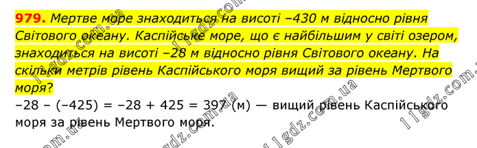 Мертве море знаходиться на висоті –430 м відносно рівня Світового океану. Каспійське море, що є найбільшим у світі озером, знаходиться на висоті –28 м відносно рівня Світового океану. На скільки метрів рівень Каспійського моря вищий за рівень Мертвого моря? –28 – (–425) = –28 + 425 = 397 (м) — вищий рівень Каспійського моря за рівень Мертвого моря.