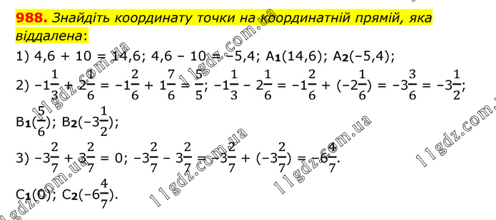 Знайдіть координату точки на координатній прямій, яка віддалена: 1) 4,6 + 10 = 14,6; 4,6 – 10 = –5,4; A1(14,6); A2(–5,4); 2) –11/3 + 21/6 = –12/6 + 17/6 = 5/5; –11/3 – 21/6 = –12/6 + (–21/6) = –33/6 = –31/2; B1(5/6); B2(–31/2); 3) –32/7 + 32/7 = 0; –32/7 – 32/7 = –32/7 + (–32/7) = –64/7. C1(0); C2(–64/7).