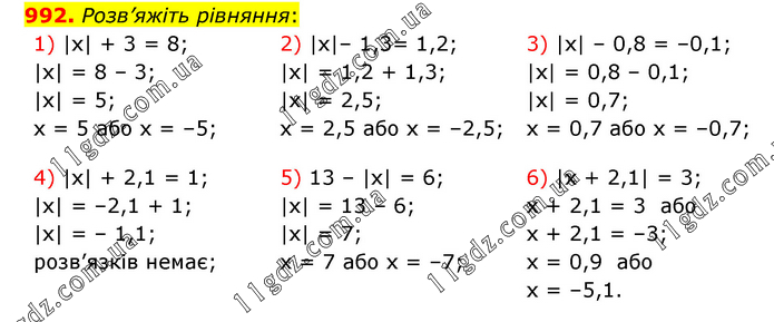 Розв’яжіть рівняння: 1) |х| + 3 = 8; |x| = 8 – 3; |x| = 5; х = 5 або х = –5; 2) |x|– 1,3= 1,2; |х| = 1,2 + 1,3; |х| = 2,5; х = 2,5 або х = –2,5; 3) |х| – 0,8 = –0,1; |x| = 0,8 – 0,1; |x| = 0,7; x = 0,7 або x = –0,7; 4) |х| + 2,1 = 1; |х| = –2,1 + 1; |х| = – 1,1; розв’язків немає; 5) 13 – |х| = 6; |х| = 13 – 6; |х| = 7; x = 7 або x = –7; 6) |х + 2,1| = 3; x + 2,1 = 3 або x + 2,1 = –3; x = 0,9 або х = –5,1.