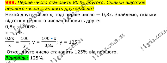Перше число становить 80 % другого. Скільки відсотків першого числа становить друге число? Нехай друге число х, тоді перше число — 0,8х. Знайдемо, скільки відсотків першого числа становить друге: 0,8х — 100%, х — у%. 0,8х/х = 100/у; у = (100 • х)/0,8х; у = 125. Отже, друге число становить 125% від першого. Відповідь: 125%.