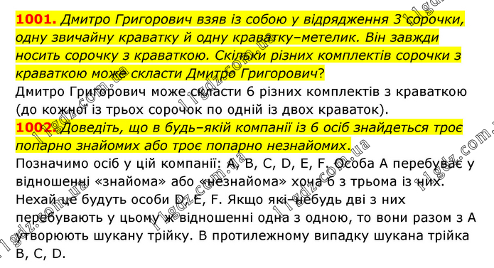1001. Дмитро Григорович взяв із собою у відрядження 3 сорочки, одну звичайну краватку й одну краватку–метелик. Він завжди носить сорочку з краваткою. Скільки різних комплектів сорочки з краваткою може скласти Дмитро Григорович? Дмитро Григорович може скласти 6 різних комплектів з краваткою (до кожної із трьох сорочок по одній із двох краваток). 1002. Доведіть, що в будь–якій компанії із 6 осіб знайдеться троє попарно знайомих або троє попарно незнайомих. Позначимо осіб у цій компанії: А, В, С, D, Е, F. Особа А перебуває у відношенні «знайома» або «незнайома» хоча б з трьома із них. Нехай це будуть особи D, Е, F. Якщо які–небудь дві з них перебувають у цьому ж відношенні одна з одною, то вони разом з А утворюють шукану трійку. В протилежному випадку шукана трійка В, С, D.