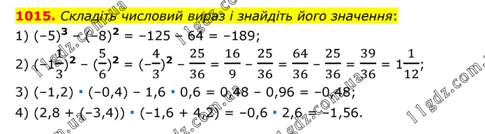 Складіть числовий вираз і знайдіть його значення: 1) (–5)3 – (–8)2 = –125 – 64 = –189; 2) (–11/3)2 – (5/6)2 = (–4/3)2 – 25/36 = 16/9 – 25/36 = 64/36 – 25/36 = 39/36 = 11/12; 3) (–1,2) ∙ (–0,4) – 1,6 ∙ 0,6 = 0,48 – 0,96 = –0,48; 4) (2,8 + (–3,4)) ∙ (–1,6 + 4,2) = –0,6 ∙ 2,6 = –1,56.