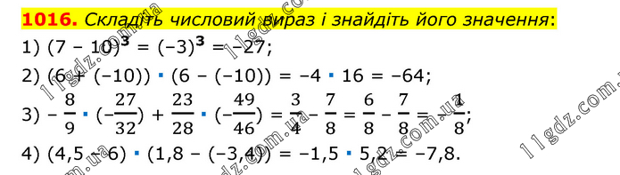 Складіть числовий вираз і знайдіть його значення: 1) (7 – 10)3 = (–3)3 = –27; 2) (6 + (–10)) ∙ (6 – (–10)) = –4 ∙ 16 = –64; 3) – 8/9 ∙ (–27/32) + 23/28 ∙ (–49/46) = 3/4 – 7/8 = 6/8 – 7/8 = – 1/8; 4) (4,5 – 6) ∙ (1,8 – (–3,4)) = –1,5 ∙ 5,2 = –7,8.