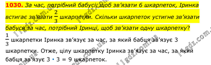 За час, потрібний бабусі, щоб зв’язати 6 шкарпеток, Іринка встигає зв’язати 2/3 шкарпетки. Скільки шкарпеток устигне зв’язати бабуся за час, потрібний Іринці, щоб зв’язати одну шкарпетку? 1/3 шкарпетки Іринка зв’язує за час, за який бабця зв’язує 3 шкарпетки. Отже, цілу шкарпетку Іринка зв’язує за час, за який бабця зв’язує 3 ∙ 3 = 9 шкарпеток.