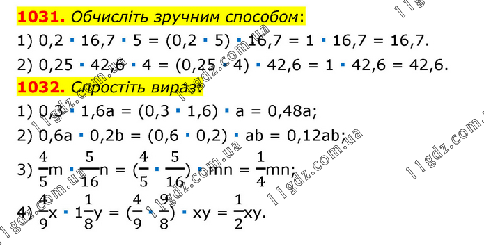 1031. Обчисліть зручним способом: 1) 0,2 ∙ 16,7 ∙ 5 = (0,2 ∙ 5) ∙ 16,7 = 1 ∙ 16,7 = 16,7. 2) 0,25 ∙ 42,6 ∙ 4 = (0,25 ∙ 4) ∙ 42,6 = 1 ∙ 42,6 = 42,6. 1032. Спростіть вираз: 1) 0,3 ∙ 1,6а = (0,3 ∙ 1,6) ∙ а = 0,48а; 2) 0,6а ∙ 0,2b = (0,6 ∙ 0,2) ∙ аb = 0,12аb; 3) 4/5m ∙ 5/16n = (4/5 ∙ 5/16) ∙ mn = 1/4mn; 4) 4/9x ∙ 11/8y = (4/9 ∙ 9/8) ∙ xy = 1/2xy.