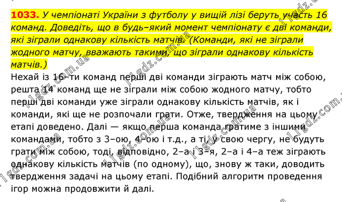 У чемпіонаті України з футболу у вищій лізі беруть участь 16 команд. Доведіть, що в будь–який момент чемпіонату є дві команди, які зіграли однакову кількість матчів. (Команди, які не зіграли жодного матчу, вважають такими, що зіграли однакову кількість матчів.) Нехай із 16–ти команд перші дві команди зіграють матч між собою, решта 14 команд ще не зіграли між собою жодного матчу, тобто перші дві команди уже зіграли однакову кількість матчів, як і команди, які ще не розпочали грати. Отже, твердження на цьому етапі доведено. Далі — якщо перша команда гратиме з іншими командами, тобто з 3–ою, 4–ою і т.д., а ті, у свою чергу, не будуть грати між собою, тоді, відповідно, 2–а і 3–я, 2–а і 4–а теж зіграють однакову кількість матчів (по одному), що, знову ж таки, доводить твердження задачі на цьому етапі. Подібний алгоритм проведення ігор можна продовжити й далі.