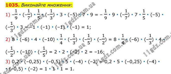 Виконайте множення: 1) –1/9 ∙ (–1/7) ∙ 1/5 ∙ (–1/3) ∙ 3 ∙ (–5) ∙ 7 ∙ 9 = – 1/9 ∙ 9 ∙ (–1/7) ∙ 7 ∙ 1/5 ∙ (–5) ∙ (–1/3) ∙ 3 = –1 ∙ (–1) ∙ (–1) ∙ (–1) = 1; 2) 8 ∙ (–6) ∙ 4 ∙ (–10) ∙ 1/4 ∙ (–1/3) ∙ (–1/5) ∙ (–1/2) = 8 ∙ 1/4 ∙ (–6) ∙ (–1/3) ∙ 4 ∙ (–1/2) ∙ (–10) ∙ (–1/5) = 2 ∙ 2 ∙ (–2) ∙ 2 = –16; 3) 0,2 ∙ (–0,25) ∙ (–0,5) ∙ 5 ∙ (–4) ∙ (–2) = 0,2 ∙ 5 ∙ (–0,25) ∙ (–4) ∙ ∙ (–0,5) ∙ (–2) = 1 ∙ 1 ∙ 1 = 1.