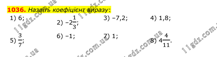 Назвіть коефіцієнт виразу: 1) 6; 2) –21/3; 3) –7,2; 4) 1,8; 5) 3/7; 6) –1; 7) 1; 8) 44/11.