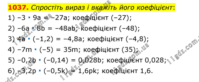 Спростіть вираз і вкажіть його коефіцієнт: 1) –3 ∙ 9а = –27а; коефіцієнт (–27); 2) –6а ∙ 8b = –48аb; коефіцієнт (–48); 3) 4а ∙ (–1,2) = –4,8а; коефіцієнт (–4,8); 4) –7m ∙ (–5) = 35m; коефіцієнт (35); 5) –0,2b ∙ (–0,14) = 0,028b; коефіцієнт 0,028; 6) –3,2р ∙ (–0,5k) = 1,6pk; коефіцієнт 1,6.