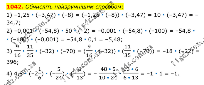 Обчисліть найзручнішим способом: 1) –1,25 ∙ (–3,47) ∙ (–8) = (–1,25 ∙ (–8)) ∙ (–3,47) = 10 ∙ (–3,47) = –34,7; 2) –0,001 ∙ (–54,8) ∙ 50 ∙ (–2) = –0,001 ∙ (–54,8) ∙ (–100) = –54,8 ∙ ∙ (–100) ∙ (–0,001) = –54,8 ∙ 0,1 = –5,48; 3) 9/16 ∙ 11/35 ∙ (–32) ∙ (–70) = (9/16 ∙ (–32)) ∙ (11/35 ∙ (–70)) = –18 ∙ (–22) = 396; 4) 4,8 ∙ (–21/6) ∙ (–5/24) ∙ (–6/13) = – (48 • 5)/(10 • 24) ∙ (13 • 6)/(6 • 13) = –1 ∙ 1 = –1.