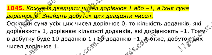 Кожне із двадцяти чисел дорівнює 1 або –1, а їхня сума дорівнює 0. Знайдіть добуток цих двадцяти чисел. Оскільки сума усіх цих чисел дорівнює 0, то кількість доданків, які дорівнюють 1, дорівнює кількості доданків, які дорівнюють –1. Тому в добутку буде 10 доданків 1 і 10 доданків –1. А отже, добуток цих чисел дорівнює 1.
