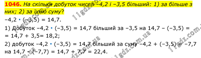 На скільки добуток чисел –4,2 і –3,5 більший: 1) за більше з них; 2) за їхню суму? –4,2 ∙ (–3,5) = 14,7. 1) Добуток –4,2 ∙ (–3,5) = 14,7 більший за –3,5 на 14,7 – (–3,5) = = 14,7 + 3,5= 18,2; 2) добуток –4,2 ∙ (–3,5) = 14,7 більший за суму –4,2 + (–3,5) = –7,7 на 14,7 – (–7,7) = 14,7 + 7,7 = 22,4.