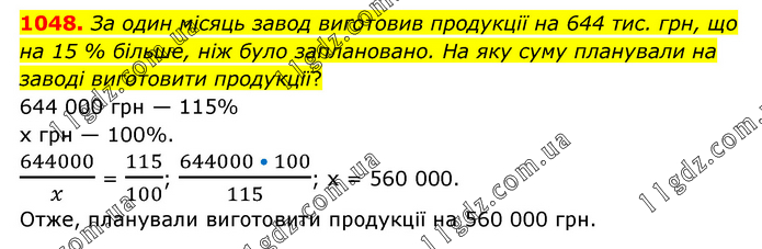 За один місяць завод виготовив продукції на 644 тис. грн, що на 15 % більше, ніж було заплановано. На яку суму планували на заводі виготовити продукції? 644 000 грн — 115% х грн — 100%. 644000/x = 115/100; (644000 • 100)/115; х = 560 000. Отже, планували виготовити продукції на 560 000 грн.