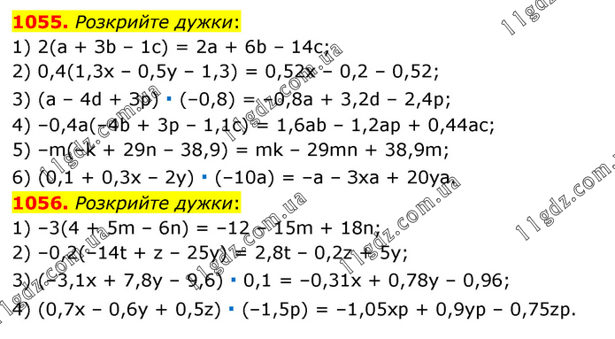 1055. Розкрийте дужки: 1) 2(а + Зb – 1с) = 2а + 6b – 14с; 2) 0,4(1,3х – 0,5у – 1,3) = 0,52х – 0,2 – 0,52; 3) (а – 4d + Зр) ∙ (–0,8) = –0,8а + 3,2d – 2,4р; 4) –0,4а(–4b + 3p – 1,1c) = 1,6ab – 1,2ap + 0,44ac; 5) –m(–k + 29n – 38,9) = mk – 29mn + 38,9m; 6) (0,1 + 0,3х – 2у) ∙ (–10а) = –а – Зха + 20уа. 1056. Розкрийте дужки: 1) –3(4 + 5m – 6n) = –12 – 15m + 18n; 2) –0,2(–14t + z – 25у) = 2,8t – 0,2z + 5у; 3) (–3,1x + 7,8у – 9,6) ∙ 0,1 = –0,31х + 0,78у – 0,96; 4) (0,7х – 0,6у + 0,5z) ∙ (–1,5р) = –1,05хр + 0,9yр – 0,75zр.