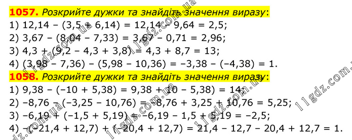 1057. Розкрийте дужки та знайдіть значення виразу: 1) 12,14 – (3,5 + 6,14) = 12,14 – 9,64 = 2,5; 2) 3,67 – (8,04 – 7,33) = 3,67 – 0,71 = 2,96; 3) 4,3 + (9,2 – 4,3 + 3,8) = 4,3 + 8,7 = 13; 4) (3,98 – 7,36) – (5,98 – 10,36) = –3,38 – (–4,38) = 1. 1058. Розкрийте дужки та знайдіть значення виразу: 1) 9,38 – (–10 + 5,38) = 9,38 + 10 – 5,38) = 14; 2) –8,76 – (–3,25 – 10,76) = –8,76 + 3,25 + 10,76 = 5,25; 3) –6,19 + (–1,5 + 5,19) = –6,19 – 1,5 + 5,19 = –2,5; 4) –(–21,4 + 12,7) + (–20,4 + 12,7) = 21,4 – 12,7 – 20,4 + 12,7 = 1.