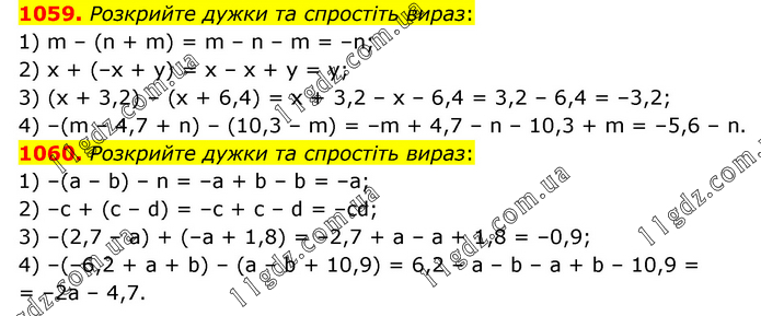 1059. Розкрийте дужки та спростіть вираз: 1) m – (n + m) = m – n – m = –n; 2) x + (–х + у) = х – х + у = у; 3) (х + 3,2) – (х + 6,4) = х + 3,2 – х – 6,4 = 3,2 – 6,4 = –3,2; 4) –(m – 4,7 + n) – (10,3 – m) = –m + 4,7 – n – 10,3 + m = –5,6 – n. 1060. Розкрийте дужки та спростіть вираз: 1) –(а – b) – n = –а + b – b = –а; 2) –с + (с – d) = –с + с – d = –cd; 3) –(2,7 – а) + (–а + 1,8) = –2,7 + а – а + 1,8 = –0,9; 4) –(–6,2 + а + b) – (а – b + 10,9) = 6,2 – а – b – а + b – 10,9 = = –2а – 4,7.