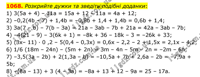 Розкрийте дужки та зведіть подібні доданки: 1) 3(5a + 4) – 11а = 15а + 12 – 11а = 4а + 12; 2) –0,2(4b – 7) + 1,4b = –0,8b + 1,4 + 1,4b = 0,6b + 1,4; 3) За(7 – b) – 7(b – За) = 21а – Заb – 7b + 21а = 42а – Заb – 7b; 4) –4(21 – 9) – 3(6k + 1) = –8k + 36 – 18k – 3 = –26k + 33; 5) (Зх– 11) ∙ 0 ,2 – 5(0,4 – 0,3х) = 0,6х – 2,2 – 2 + 1,5x = 2,1х – 4,2; 6) 1/6 (18m – 24n) – (5m + 2n) = Зm – 4n – 5m – 2n = –2m – 6n; 7) –3,5(3а – 2b) + 2(1,3а – b) = –10,5а + 7b + 2,6а – 2b = –7,9а + 5b; 8) –(8а – 13) + 3 (4 – За) = –8а + 13 + 12 – 9а = 25 – 17а.