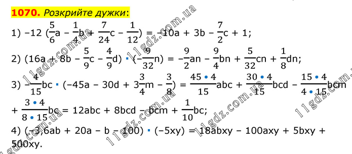 Розкрийте дужки: 1) –12 (5/6a – 1/4b + 7/24c – 1/12) = –10a + 3b – 7/2c + 1; 2) (16a + 8b – 5/9c – 4/9d) ∙ (–9/32n) = –9/2an – 9/4bn + 5/32cn + 1/8dn; 3) –4/15bc ∙ (–45a – 30d + 33/4m – 3/8) = (45 • 4)/15abc + (30 • 4)/15bcd – (15 • 4)/(4 • 15)bcm + (3 • 4)/(8 • 15)bc = 12abc + 8bcd – bcm + 1/10bc; 4) (–3,6аb + 20а – b – 100) ∙ (–5ху) = 18аbху – 100аху + 5bху + 500ху.