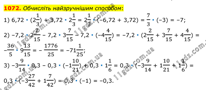 Обчисліть найзручнішим способом: 1) 6,72 ∙ (21/3) + 3,72 ∙ 21/3 = 21/3 ∙ (–6,72 + 3,72) = 7/3 ∙ (–3) = –7; 2) –7,2 ∙ 22/15 – 7,2 ∙ 37/15 – 7,2 ∙ (–44/15) = –7,2 ∙ (22/15 + 37/15 + 44/15) = –36/5 ∙ 913/15 = – 1776/25 = –711/25; 3) –39/14 ∙ 0,3 – 0,3 ∙ (–110/21) + 0,3 ∙ 11/6 = 0,3 ∙ (–39/14 + 110/21 + 11/6) = 0,3 ∙ (–327/42 + 17/42) = 0,3 ∙ (–1) = –0,3.