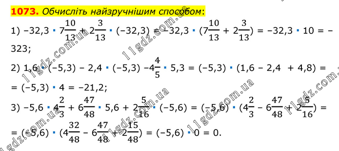 Обчисліть найзручнішим способом: 1) –32,3 ∙ 710/13 + 23/13 ∙ (–32,3) = –32,3 ∙ (710/13 + 23/13) = –32,3 ∙ 10 = –323; 2) 1,6 ∙ (–5,3) – 2,4 ∙ (–5,3) –44/5 ∙ 5,3 = (–5,3) ∙ (1,6 – 2,4 + 4,8) = = (–5,3) ∙ 4 = –21,2; 3) –5,6 ∙ 42/3 + 647/48 ∙ 5,6 + 25/16 ∙ (–5,6) = (–5,6) ∙ (42/3 – 647/48 + 25/16) = = (–5,6) ∙ (432/48 – 647/48 + 215/48) = (–5,6) ∙ 0 = 0.