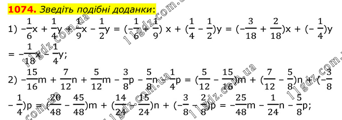 Зведіть подібні доданки: 1) –1/6x + 1/4y + 1/9x – 1/2y = (–1/6 + 1/9) x + (1/4 – 1/2)y = (–3/18 + 2/18)x + (– 1/4)y = –1/18x – 1/4y; 2) –15/16m + 7/12n + 5/12m – 3/8p – 5/8n – 1/4p = (5/12 – 15/16)m + (7/12 – 5/8)n + (–3/8 – 1/4)p = (20/48 – 45/48)m + (14/24 – 15/24)n + (–3/8 – 2/8)p = –25/48m – 1/24n – 5/8p;