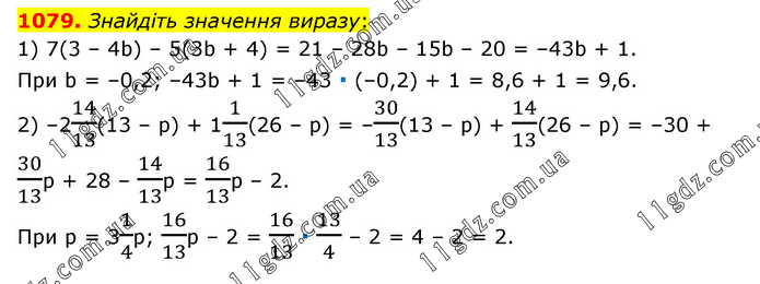 Знайдіть значення виразу: 1) 7(3 – 4b) – 5(3b + 4) = 21 – 28b – 15b – 20 = –43b + 1. При b = –0,2; –43b + 1 = –43 ∙ (–0,2) + 1 = 8,6 + 1 = 9,6. 2) –214/13(13 – p) + 11/13(26 – p) = –30/13(13 – p) + 14/13(26 – p) = –30 + 30/13p + 28 – 14/13p = 16/13p – 2. При p = 31/4p; 16/13p – 2 = 16/13 ∙ 13/4 – 2 = 4 – 2 = 2.