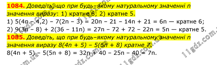 1084. Доведіть, що при будь–якому натуральному значенні n значення виразу: 1) кратне 6; 2) кратне 5. 1) 5(4n – 4,2) – 7(2n – 3) = 20n – 21 – 14n + 21 = 6n — кратне 6; 2) 9(Зn – 8) + 2(36 – 11n) = 27n – 72 + 72 – 22n = 5n — кратне 5. 1085. Доведіть, що при будь–якому натуральному значенні n значення виразу 8(4n + 5) – 5(5n + 8) кратне 7. 8(4n + 5) – 5(5n + 8) = 32n + 40 – 25n – 40 = 7n.