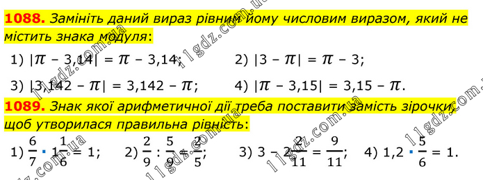 1088. Замініть даний вираз рівним йому числовим виразом, який не містить знака модуля: 1) |π – 3,14| = π – 3,14; 2) |3 – π| = π – 3; 3) |3,142 – π| = 3,142 – π; 4) |π – 3,15| = 3,15 – π. 1089. Знак якої арифметичної дії треба поставити замість зірочки, щоб утворилася правильна рівність: 1) 6/7 ∙ 11/6 = 1; 2) 2/9 : 5/9 = 2/5; 3) 3 – 22/11 = 9/11; 4) 1,2 ∙ 5/6 = 1.
