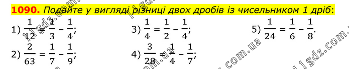 Подайте у вигляді різниці двох дробів із чисельником 1 дріб: 1) 1/12 = 1/3 – 1/4; 2) 2/63 = 1/7 – 1/9; 3) 1/4 = 1/2 – 1/4; 4) 3/28 = 1/4 – 1/7; 5) 1/24 = 1/6 – 1/8.