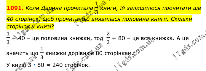 Коли Дарина прочитала 1/3 книги, їй залишилося прочитати ще 40 сторінок, щоб прочитаною виявилася половина книги. Скільки сторінок у книзі? 1/3 + 40 – це половина книжки, тоді 2/3 + 80 – це вся книжка. А це значить що 1/3 книжки дорівнює 80 сторінкам. У книзі 3 ∙ 80 = 240 сторінок.