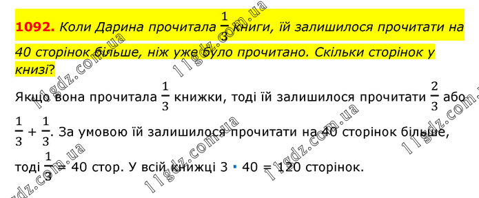 Коли Дарина прочитала 1/3 книги, їй залишилося прочитати на 40 сторінок більше, ніж уже було прочитано. Скільки сторінок у книзі? Якщо вона прочитала 1/3 книжки, тоді їй залишилося прочитати 2/3 або 1/3 + 1/3. За умовою їй залишилося прочитати на 40 сторінок більше, тоді 1/3 = 40 стор. У всій книжці 3 ∙ 40 = 120 сторінок.