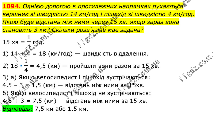 Однією дорогою в протилежних напрямках рухаються вершник зі швидкістю 14 км/год і пішохід зі швидкістю 4 км/год. Якою буде відстань між ними через 15 хв, якщо зараз вона становить 3 км? Скільки розв’язків має задача? 15 хв = 1/4 год. 1) 14 + 4 = 18 (км/год) — швидкість віддалення. 2) 18 ∙ 1/4 = 4,5 (км) — пройшли вони разом за 15 хв. 3) а) Якщо велосипедист і пішохід зустрічаються: 4,5 – 3 = 1,5 (км) — відстань між ними за 15хв. б) Якщо велосипедист і пішохід не зустрічаються: 4,5 + 3 = 7,5 (км) — відстань між ними за 15 хв. Відповідь: 7,5 км або 1,5 км.