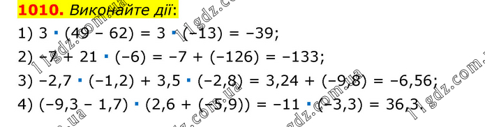 Виконайте дії: 1) 3 ∙ (49 – 62) = 3 ∙ (–13) = –39; 2) –7 + 21 ∙ (–6) = –7 + (–126) = –133; 3) –2,7 ∙ (–1,2) + 3,5 ∙ (–2,8) = 3,24 + (–9,8) = –6,56; 4) (–9,3 – 1,7) ∙ (2,6 + (–5,9)) = –11 ∙ (–3,3) = 36,3.