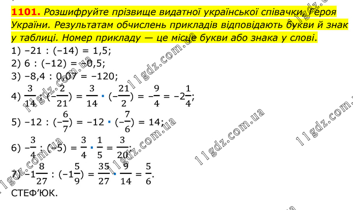 Розшифруйте прізвище видатної української співачки, Героя України. Результатам обчислень прикладів відповідають букви й знак у таблиці. Номер прикладу — це місце букви або знака у слові. 1) –21 : (–14) = 1,5; 2) 6 : (–12) = –0,5; 3) –8,4 : 0,07 = –120; 4) 3/14 : (–2/21) = 3/14 ∙ (–21/2) = –9/4 = –21/4; 5) –12 : (–6/7) = –12 ∙ (–7/6) = 14; 6) –3/4 : (–5) = 3/4 ∙ 1/5 = 3/20; 7) –18/27 : (–15/9) = 35/27 ∙ 9/14 = 5/6. СТЕФ’ЮК.